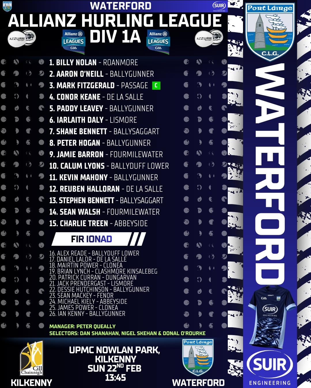 Waterford Team named to face Kilkenny for Allianz Hurling League Clash