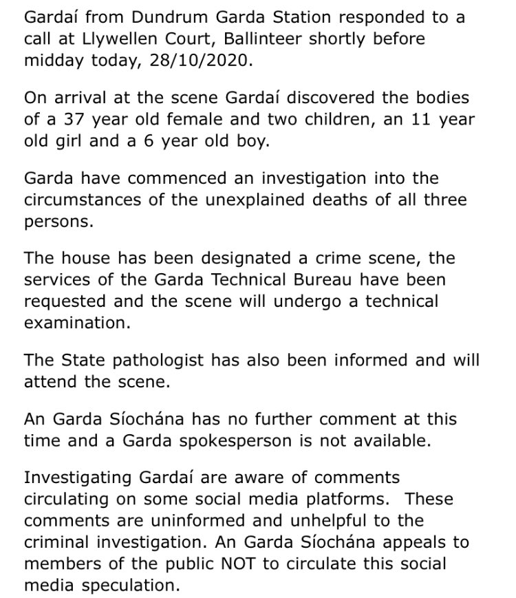 Gardai from Dundrum in Dublin have asked people not to spread rumours or to speculate on the circumstances surrounding the death of a woman and her two children in Ballinteer in Dublin earlier today. The bodies of a 37-year-old woman and two children, a 6 year old boy and an 11 year old girl, were discovered at a house on Llewellyn Drive in Ballinteer. Gardai say they are looking to speak to a man known to the victims in relation to the unexplained deaths. They released this statement asking people not to speculate about the circumstances.