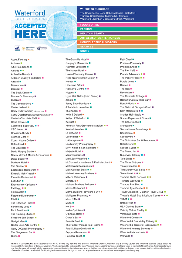 Waterford Gift Vouchers are available for purchase in Tramore Credit Union, The Book Centre and online. For a full list of places where the Waterford Gift Voucher is accepted or to become a member see waterfordchamber.ie