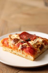 Typical of Rome this pizza is generally served by the slice with a variety of toppings.