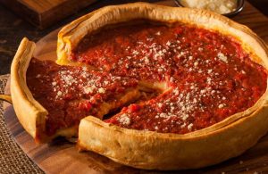 Traditionally associated with the city of Chicago, deep dish flips the pizza idea on its head with the cheese on the bottom and tomatoe sauce on the top. More like a pie than pizza.