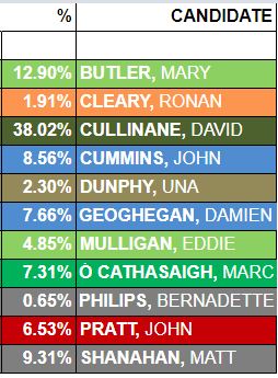 However, the tallies locally have Sinn Fein surging ahead with David Cullinane on 38% as the tallies near completion.