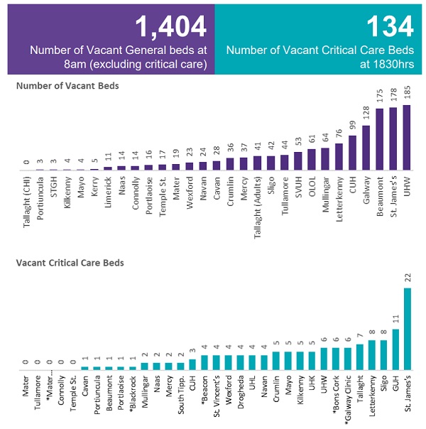The HSE figures also show that University Hospital Waterford had the most vacant beds in the country yesterday. There were 185 general beds vacant as of 8 o’clock yesterday morning. There were also 6 critical care beds vacant there yesterday evening.