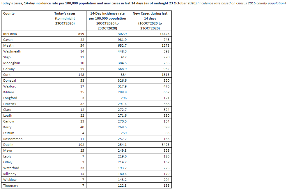 Cavan still has the highest 14-day incident rate, with 981 per 100 thousand population, compared to 302 per 100 thousand for the whole country.