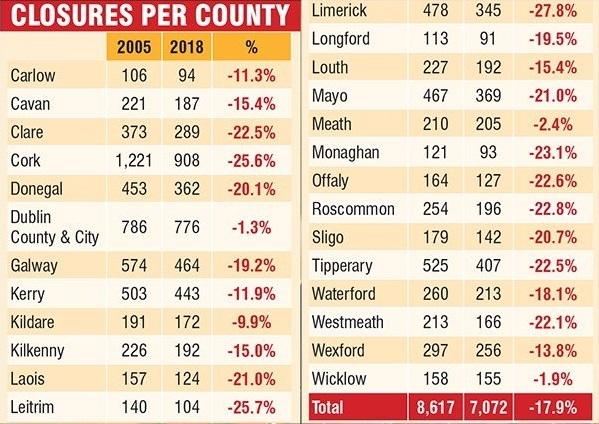 The Drinks Industry Group of Ireland analysis shows that nearly 20% of rural pubs across the country closed between 2005 and 2018, compared to just 1% in Dublin, with 71 rural pubs closing last year alone.