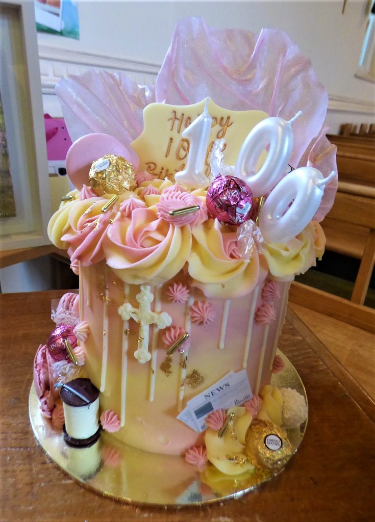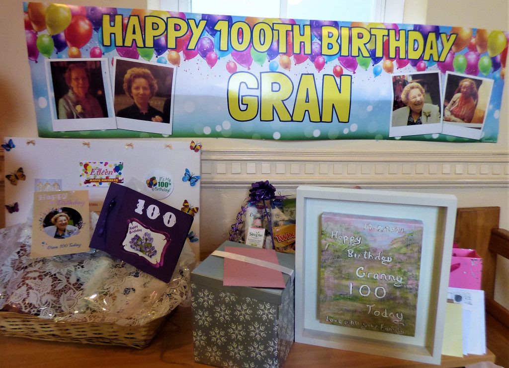 As reflected by feature items on her 100th birthday cake, Eileen loves her newspapers and appreciates fine chocolate sweets and luxury biscuits. A woman of great faith, up to recent years Eileen was also a regular at 10am Mass every morning in Ardmore. During long years of community involvement, Eileen’s talent with needle and thread can be seen in the altar cloths at both Ardmore and Grange churches. A bespoke art piece, painted by daughter-in-law Breda O’ Brien also featured in the celebration.