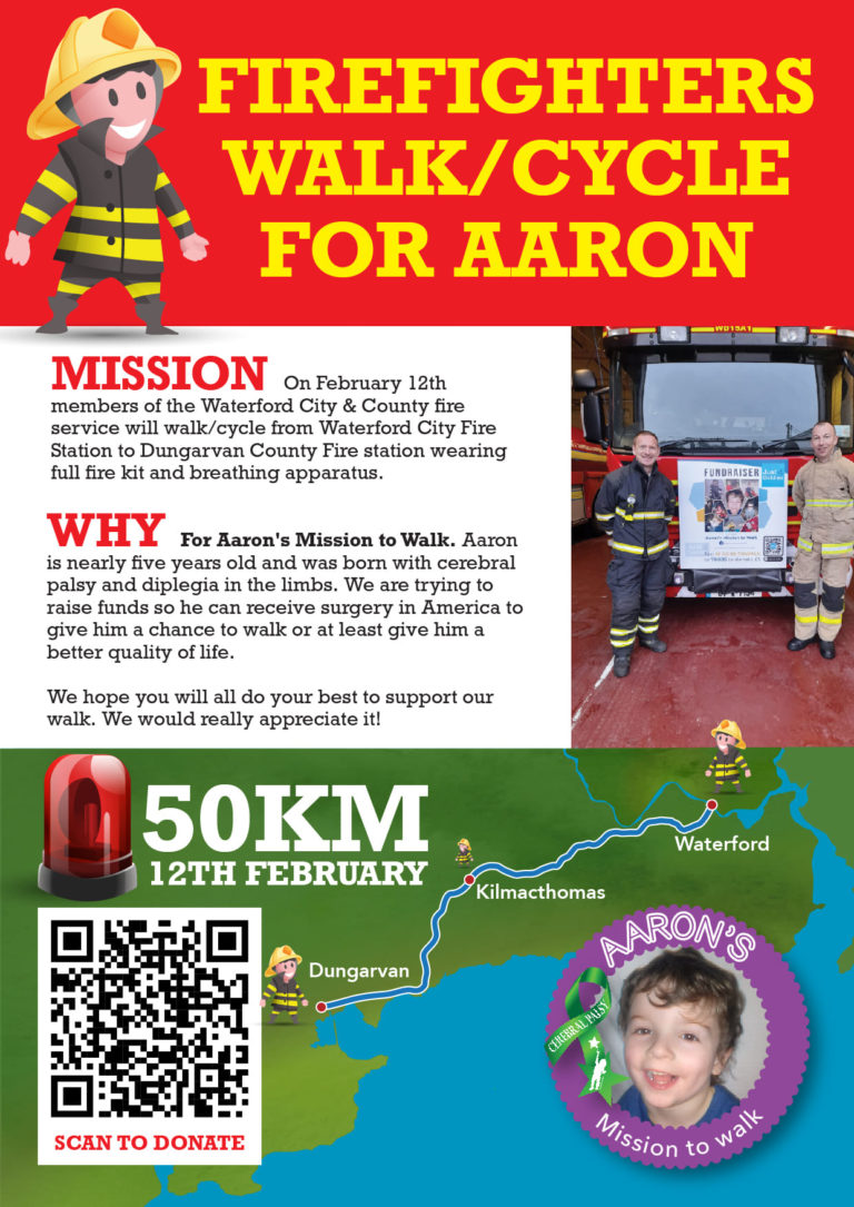 A number of firefighters from across County Waterford are setting off on a 50km walk and cycle this Saturday in a bid to raise funds for a young boy’s mission to walk.