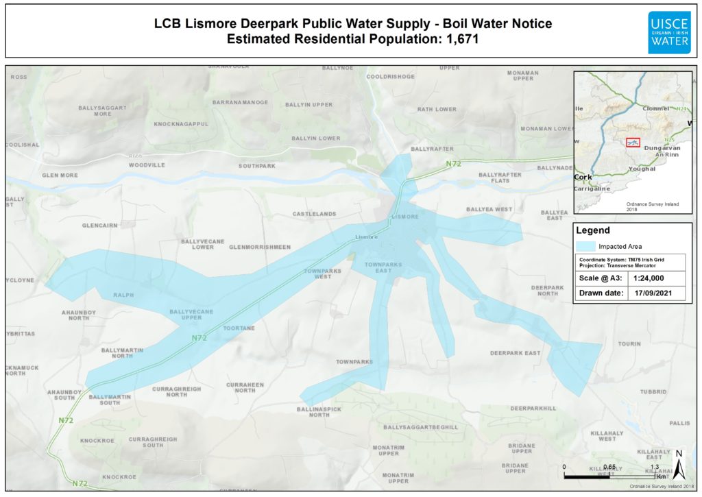 “Public health is our main priority, and after consulting with the HSE, a Boil Water Notice has been put in place on the Lismore Deerpark supply. We are working closely with our partners in Waterford City and County Council to address the issues and hope to lift the notice as soon as it is safe to do so.”