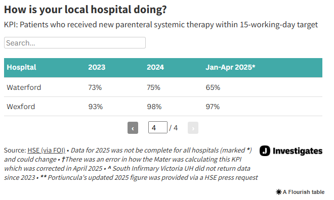 In the case of University Hospital Waterford, 73% of patients received new parenteral systemic therapy within the recommended 15-working-day target in 2023 – while the overall figure rose 2% to 75% last year in 2024.