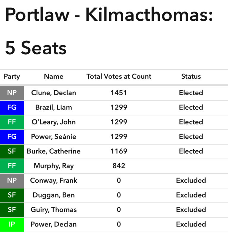 Support for Fine Gael was particularly prominent in the Portlaw-Kilmacthomas LEA, as the party saw two councillors elected on the first count.