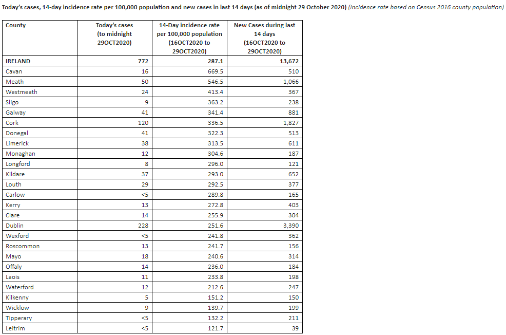 - 228 in Dublin, 120 in Cork, 50 in Meath, 41 in Donegal, 41 in Galway and the remaining 292 cases are spread across all remaining counties.