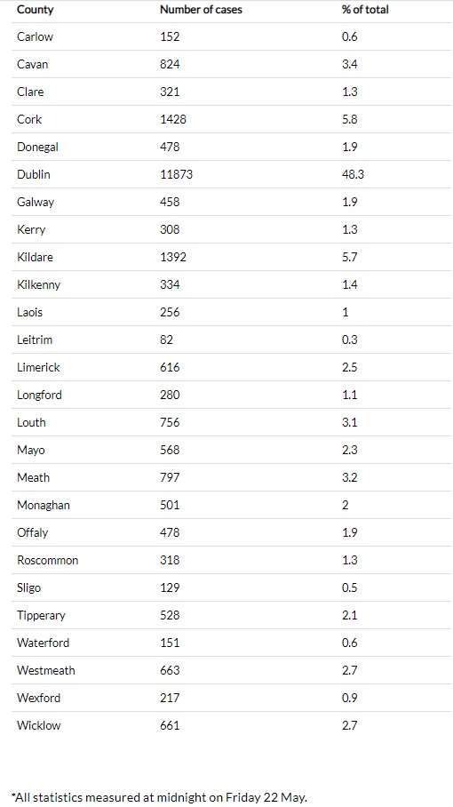 Today’s data from the HPSC, as of midnight, Friday 22 May (24,569 cases), reveals: