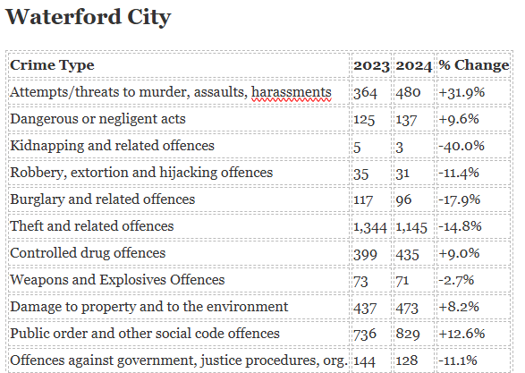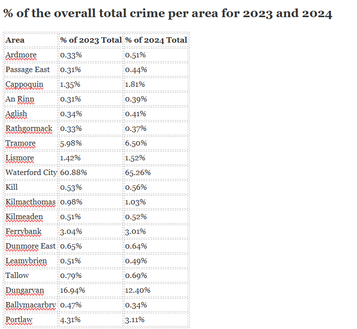 Waterford City accounts for over 65% of county-wide crime last year, compared to 61% in 2023.