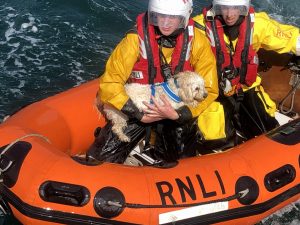The dog was sighted on a ledge at the bottom of the cliff. Two of the volunteer crew launched the lifeboat’s XP boat and made their way to the base of the cliff where one of the crew was able to climb onto the rocks to rescue ‘Ellie’ the dog.