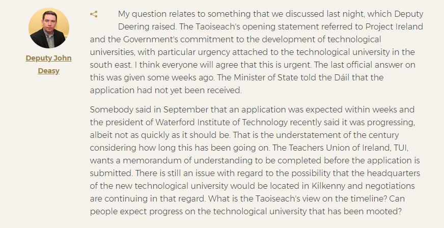 He spoke for almost two minutes questioning the Taoiseach about the Technological University for the South East.