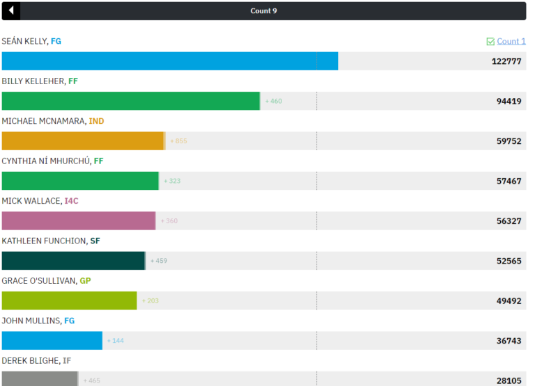 The next-placed candidate, Fianna Fáil’s Billy Kelleher, is more than 20,000 off the quota.