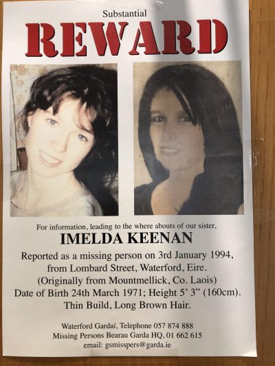 “We want the case of our missing sister, Imelda, who went missing here in 1994 in Waterford – to be pushed over the line for a murder inquiry once and for all. This meeting with An Garda Síochána in Waterford is a very, very important meeting, probably one of the most important meetings in the last 30 years. Our family have suffered mentally and physically down through the years. We’ve never given up hope of information. We think there are people here in Waterford holding back that vital bit of information that the Keenan family need. We’ll keep on trying and keep on hoping that something is going to come out of this meeting.”
