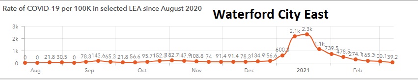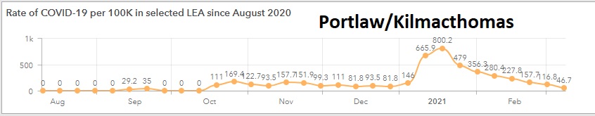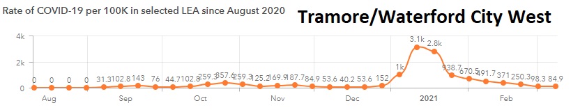 The number of cases in Portlaw/Kilmacthomas also fell by 60 per cent. There were 8 cases confirmed from the 23rd of February to the 8th of March to give an incidence rate of 46.7 per 100,000 people.