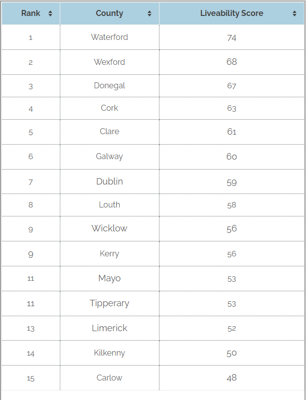 County Waterford tops the overall ranking. It is one of the sunniest counties in the country, has reasonably priced housing, is in the top 10 of most scenic counties and inhabitants have access to the facilities of Waterford City. Wexford, Donegal, Cork and Clare round out the top 5.