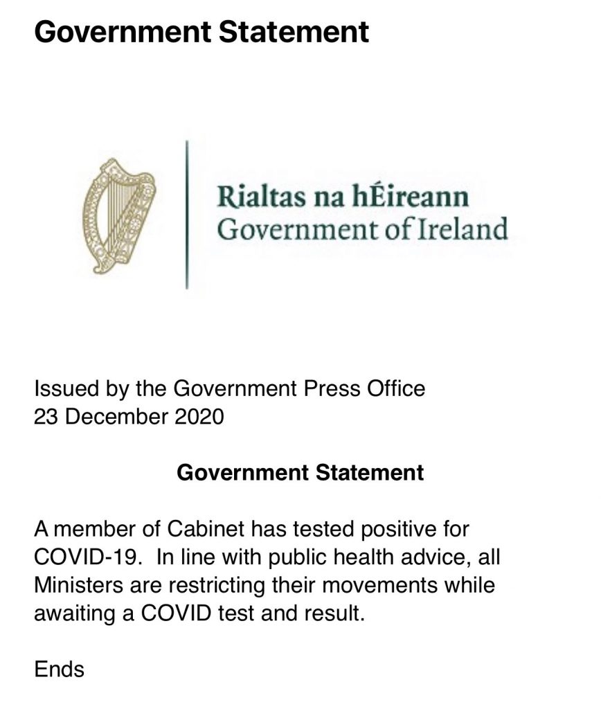 A statement from the Government said that in line with public health advice, all ministers are awaiting a Covid test and result.