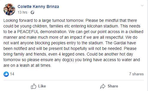 The protest starts at 6.30pm at Kilcohan Park Stadium and is due to finish at 8.00pm.