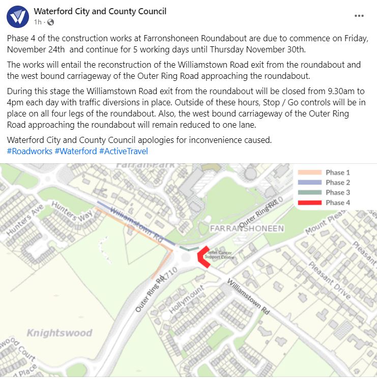 Waterford City and County Council have taken to social media to issue a statement ahead of Phase 4 of the road works at Farronshoneen in Waterford City.