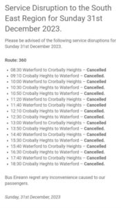 Numerous services on the newly launched 360 route linking the city and Tramore have been cancelled – details of which can be found below.