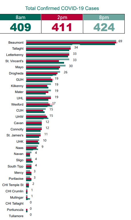 Elsewhere in the South East, there were 19 confirmed cases at St Luke’s in Kilkenny last night, 17 at Wexford General and 4 at South Tipperary General.