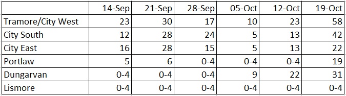 There were 31 cases in Dungarvan, up from 22 a week ago, the incidence rate is now 151.2.