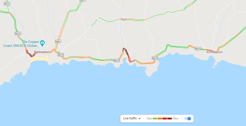 There are delays at many popular beaches in County Waterford today from Woodstown, Dunmore East, Kilmurrin and Bonmahon