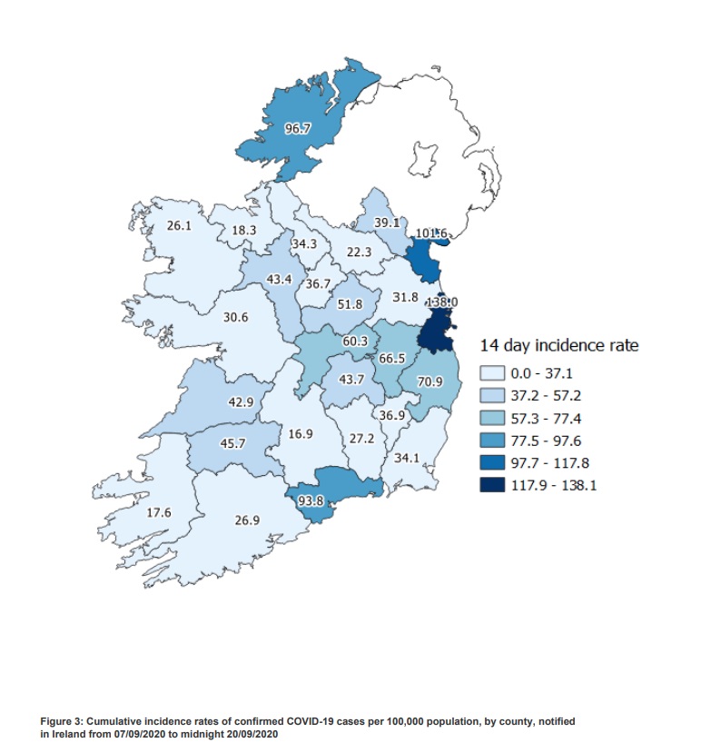 Dublin continues to have the highest rate at 138, Louth remains second at 101.1, Donegal has jumped from 72.9 on Friday to 96.7 and now has the third-highest rate.