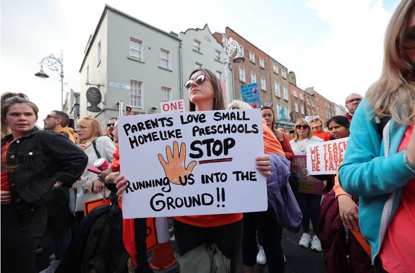Thousands of childcare providers and supporters protested outside the Dáil to demand increased funding for the sector.