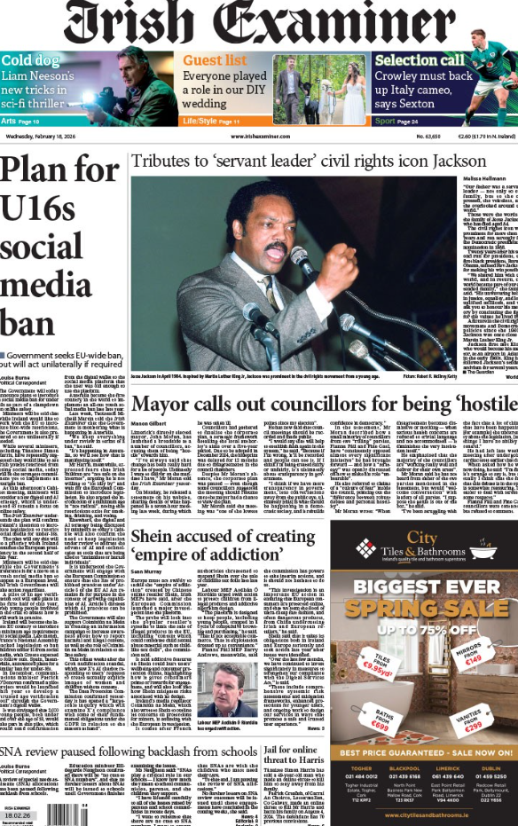 Plans for the social media ban for under 16 is the splash of the Irish Examiner.