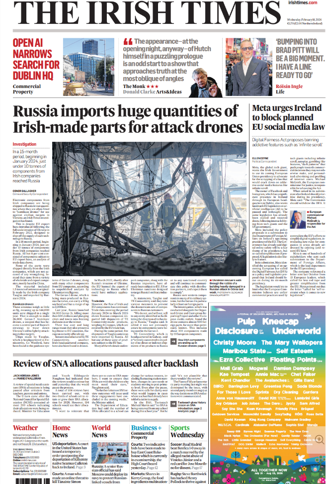 An Irish Times investigation has found that around 10 tonnes of components for so-called 'kamikaze drones' are being made by Irish companies.