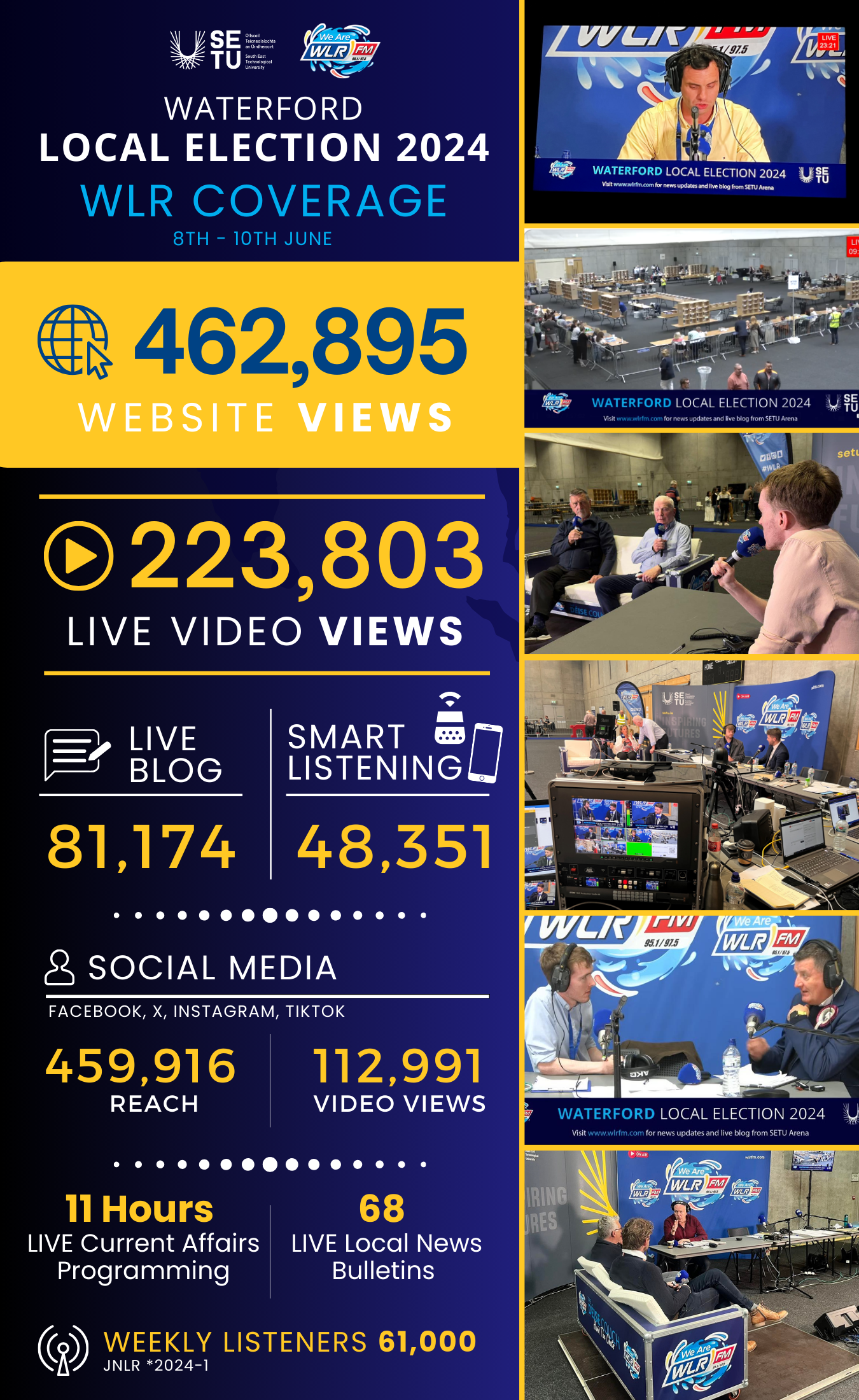 WLR’s approach was multi-platform, broadcasting on FM, online, video, and a live blog. In partnership with SETU, listeners could watch the election unfold LIVE while listening to WLR audio.