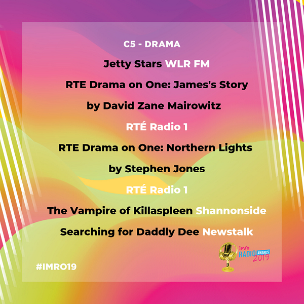 WLR’s second nomination is in the Drama category. Jetty Stars is a play for radio written by Noel Kelly and produced by Michael Grant. It was broadcast in October as part of the Imagine Arts Festival.