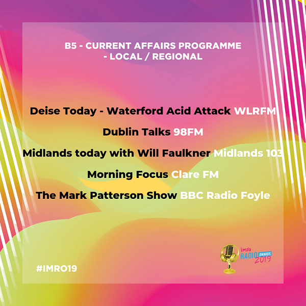 Deise Today is in the running to be named best local/regional current affairs programme. Presenter Damien Tiernan, who joined WLR in January, and his producer Jennifer Long are shortlisted for their coverage of the ‘Waterford Acid Attack’.
