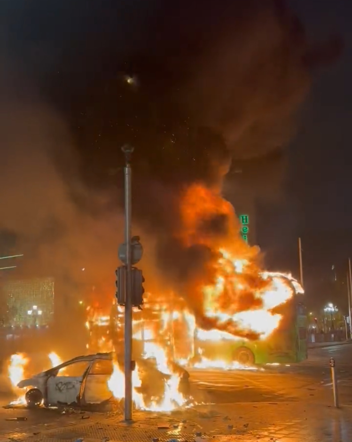 But as darkness fell, riots and mayhem ensued on our capital’s streets as thugs turned violent, looted shops and burnt out garda cars, a Luas tram, a bus and much more.