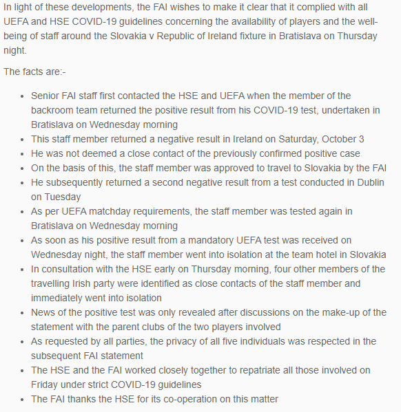 In the last few moments, an FAI statement said “A player – who cannot be named at this time – tested positive on Friday after a negative test on Monday but his case is not related in any way to that of the backroom team member who tested positive on Monday last. Talks with the HSE late last night identified four other players as close contacts of this positive case and they have been stood down from the matchday squad for today’s game against Wales.”