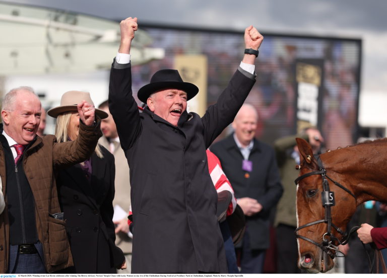 12 March 2025; Winning owner Lar Byrne celebrates after winning The Brown Advisory Novices Steeple Chase with Lecky Watson on day two of the Cheltenham Racing Festival at Prestbury Park in Cheltenham, England. Photo by Harry Murphy/Sportsfile