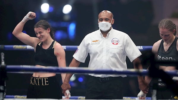 Katie Taylor celebrates winning against Delfine Persoon in the Undisputed Lightweight Title contest at the Matchroom Boxing Fight Camp in Essex, England. Photo: INPHO/Matchroom Boxing/Mark Robinson