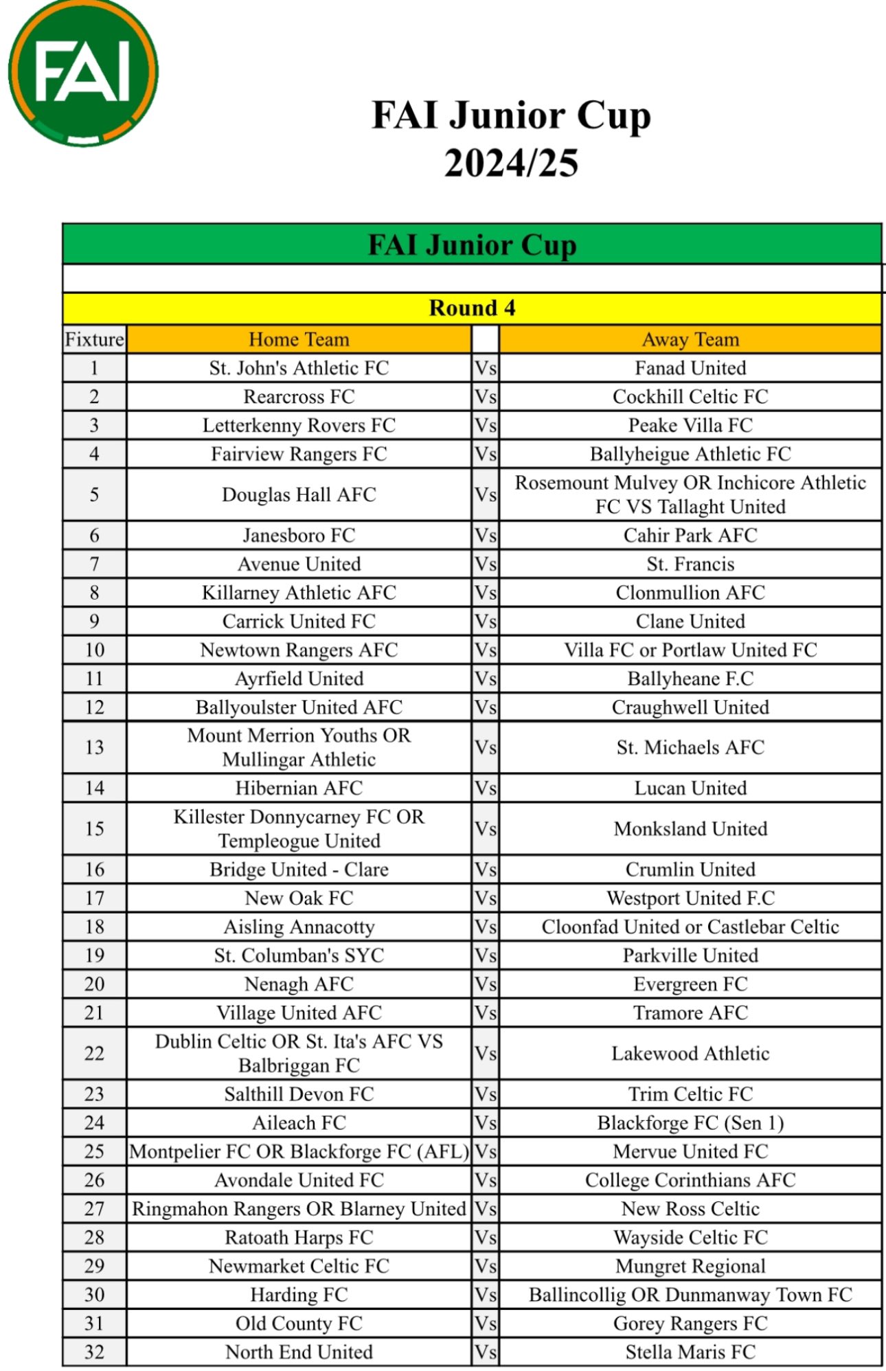 The fourth-round draw for the 2024-2025 FAI Junior Cup has seen just one of the remaining Waterford clubs drawn at home.
