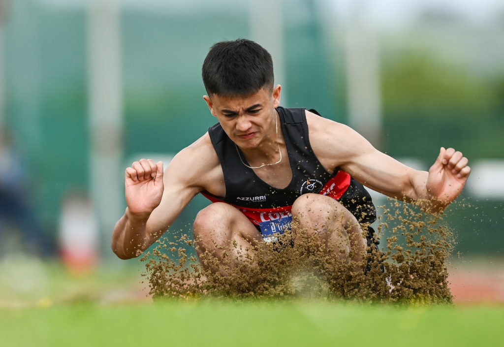 21 May 2022; Eoin Beauaventura of St Augustine’s College, Waterford, competing in the senior boys long jump