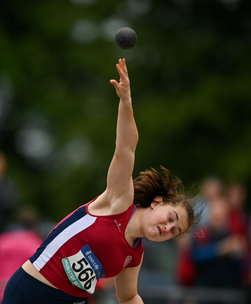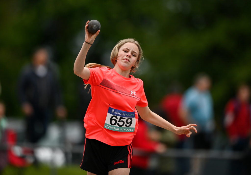 21 May 2022; Aine O’Callaghan of Waterpark College, Waterford, competing in the junior girls shot put during the Irish Life Health Munster Schools Track and Field Championships