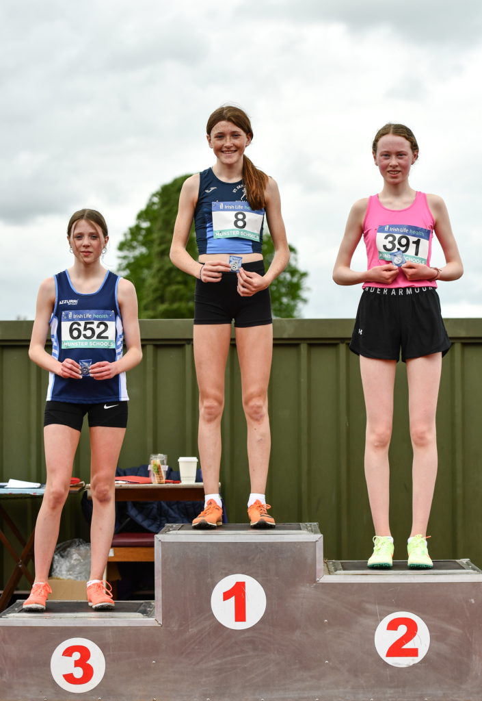 Girls U16 Mile medallists. From left: Alanna Spillane of Ursuline Secondary School, Thurles, Tipperary (bronze), Eve Dunphy of Abbey Community College, Waterford (Gold), and Noelle Dillon of Pres Listowel, Kerry (Silver)