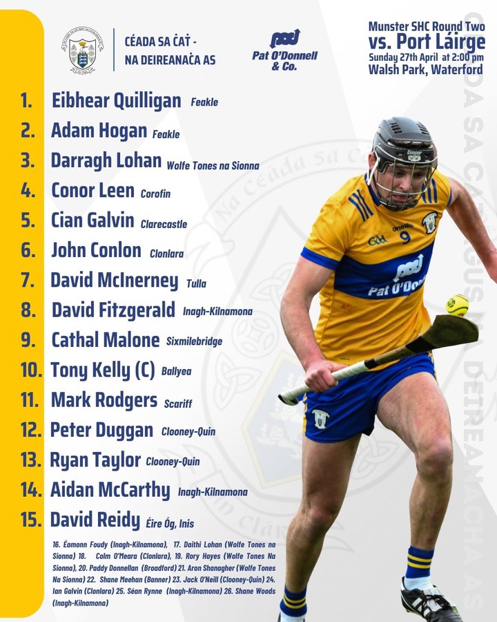 Clare have also named their team for the clash with just one change from that draw against Cork – as Cian Galvin starts in place of the injured Diarmuid Ryan.