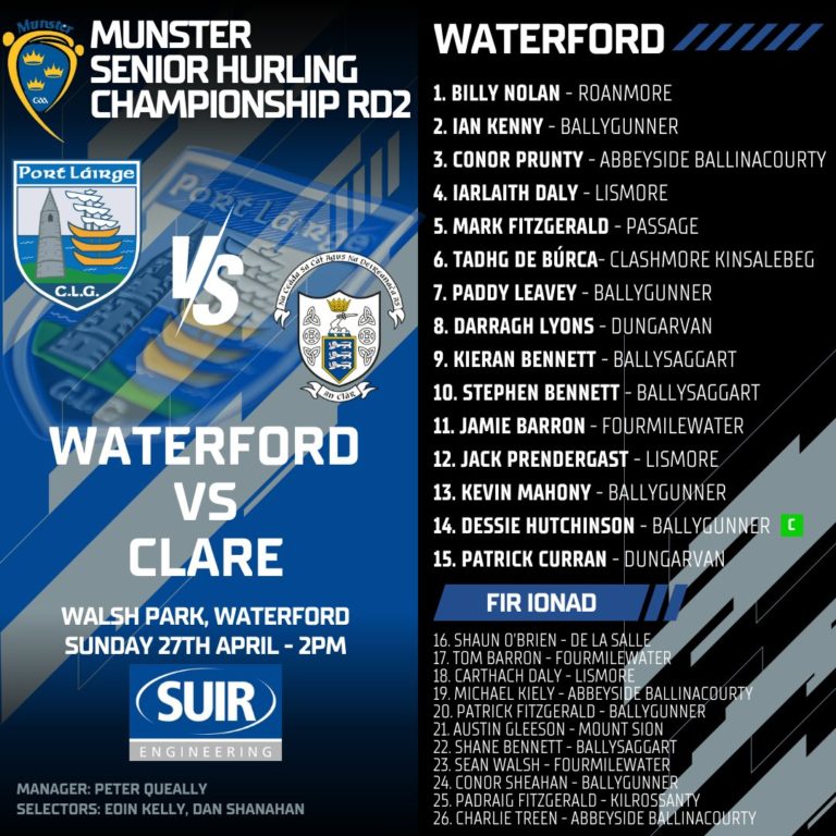 The Waterford team to face Clare in the Munster Senior Hurling Championship has been named.