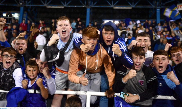 16 September 2022; Waterford supporters celebrate after their side’s victory in the Extra.ie FAI Cup Quarter-Final match between Waterford and Dundalk at the RSC in Waterford. Photo by Ben McShane/Sportsfile