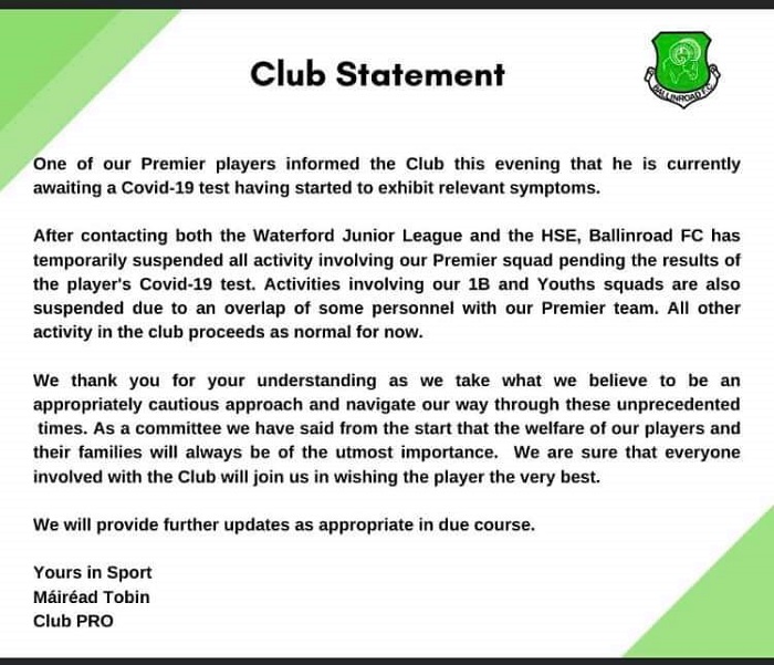 Ballinroad FC issued a statement confirming a player had informed them that he had started displaying symptoms of the virus and was waiting for a test.