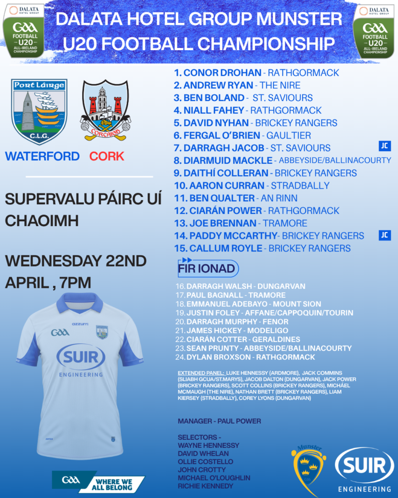 Meanwhile, Paul Power and his management team have announced the team to play Cork in the Dalata Hotel Group Munster U20 Football Championship on Wednesday, April 22nd, at Páirc Uí Chaoimh.